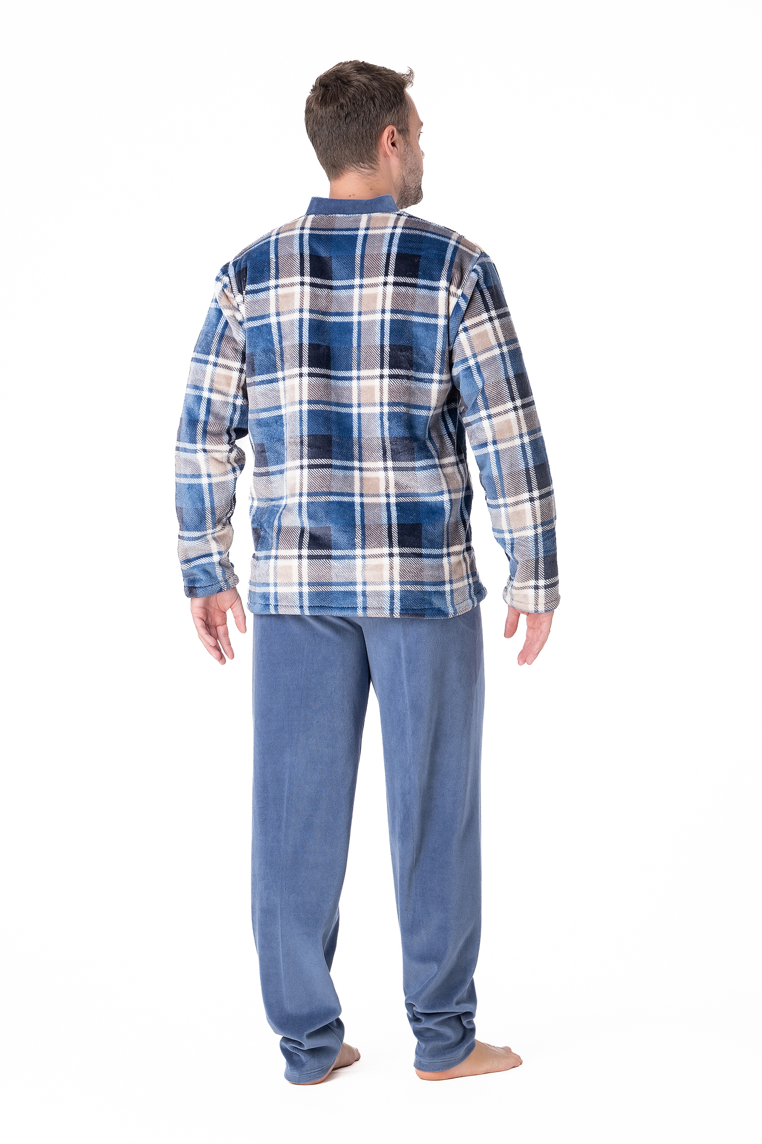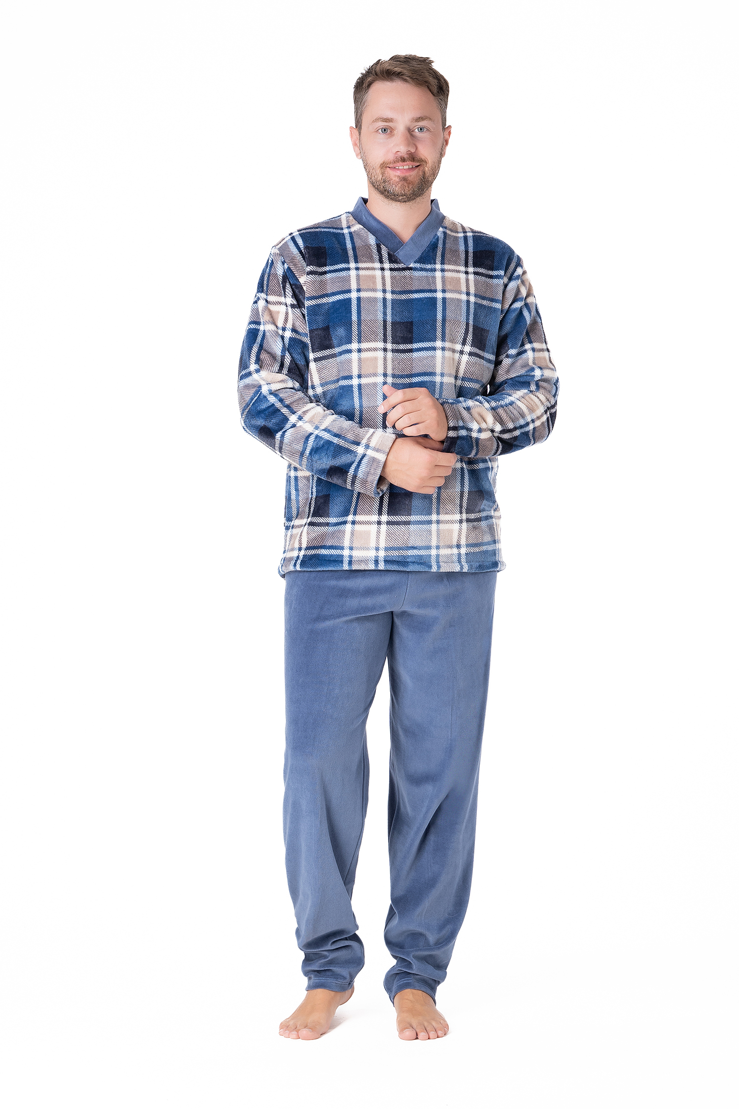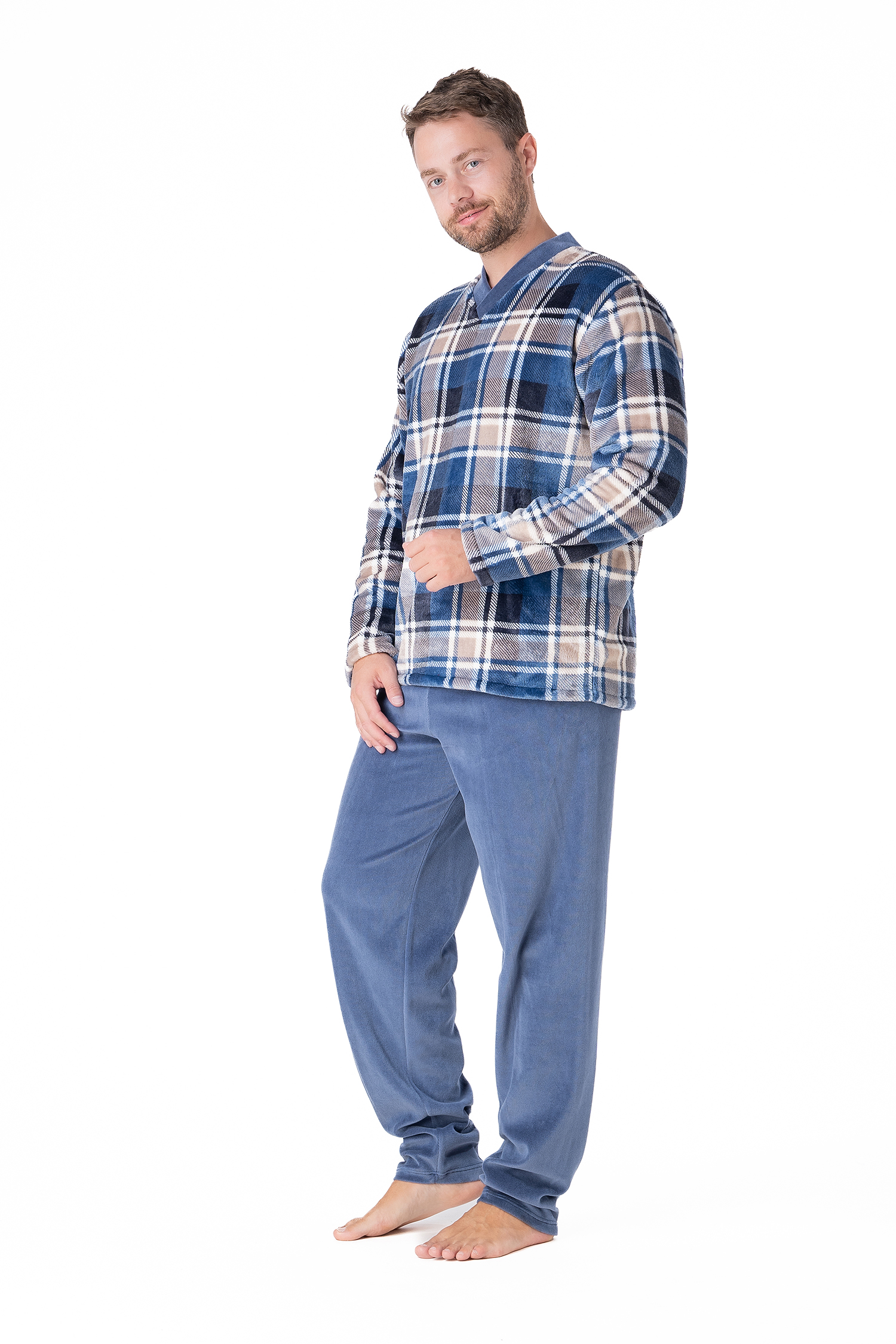 Αντρική πιτζάμα φλίς με καρό μπλούζα σε σχήμα V και μονόχρωμο απλό παντελόνι σε ίσια γραμμή.