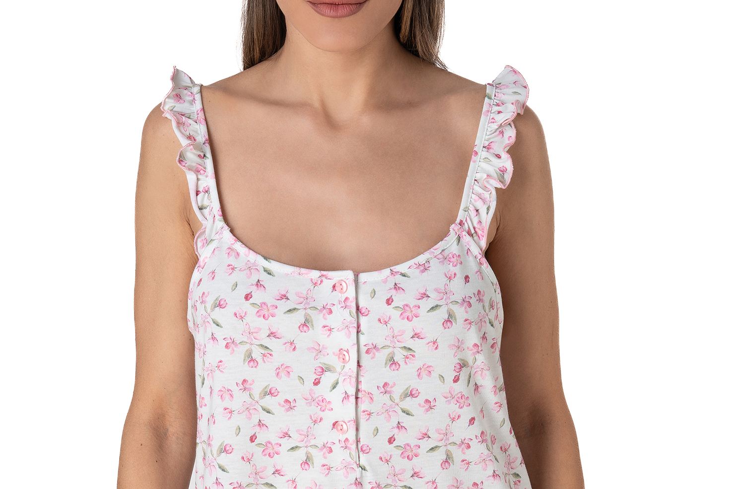 Νυχτικό με σχέδιο στην ύφανση και εντυπωσιακή Βολάν διακόσμηση στις τιράντες.