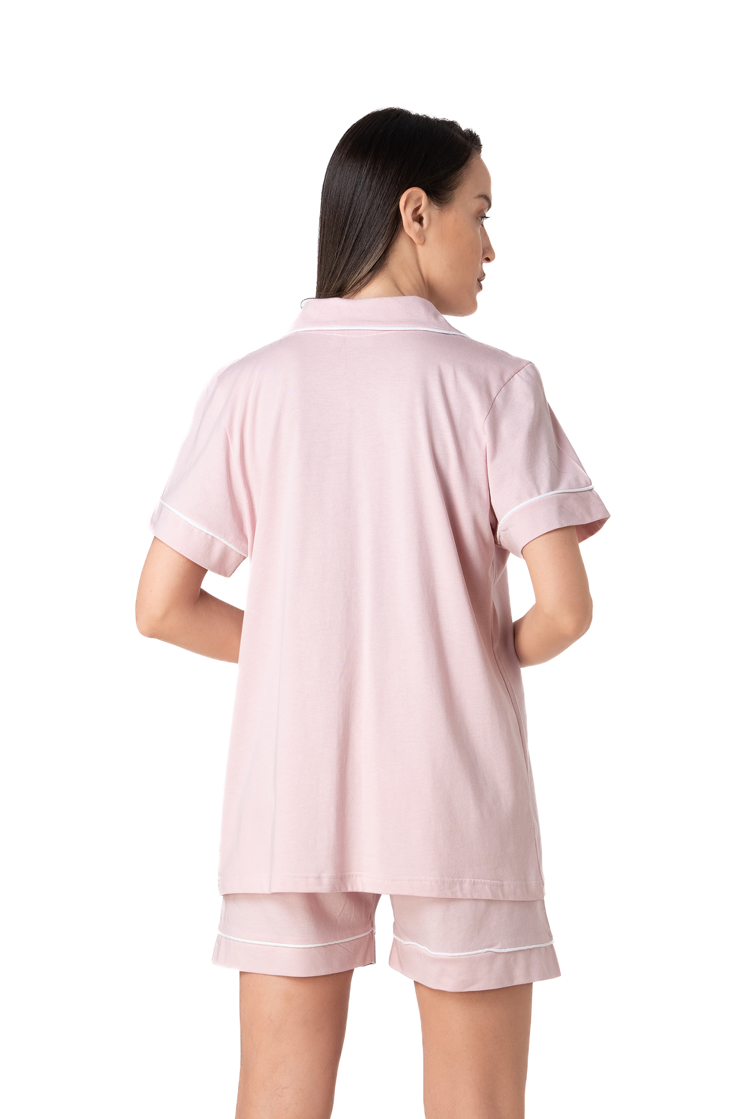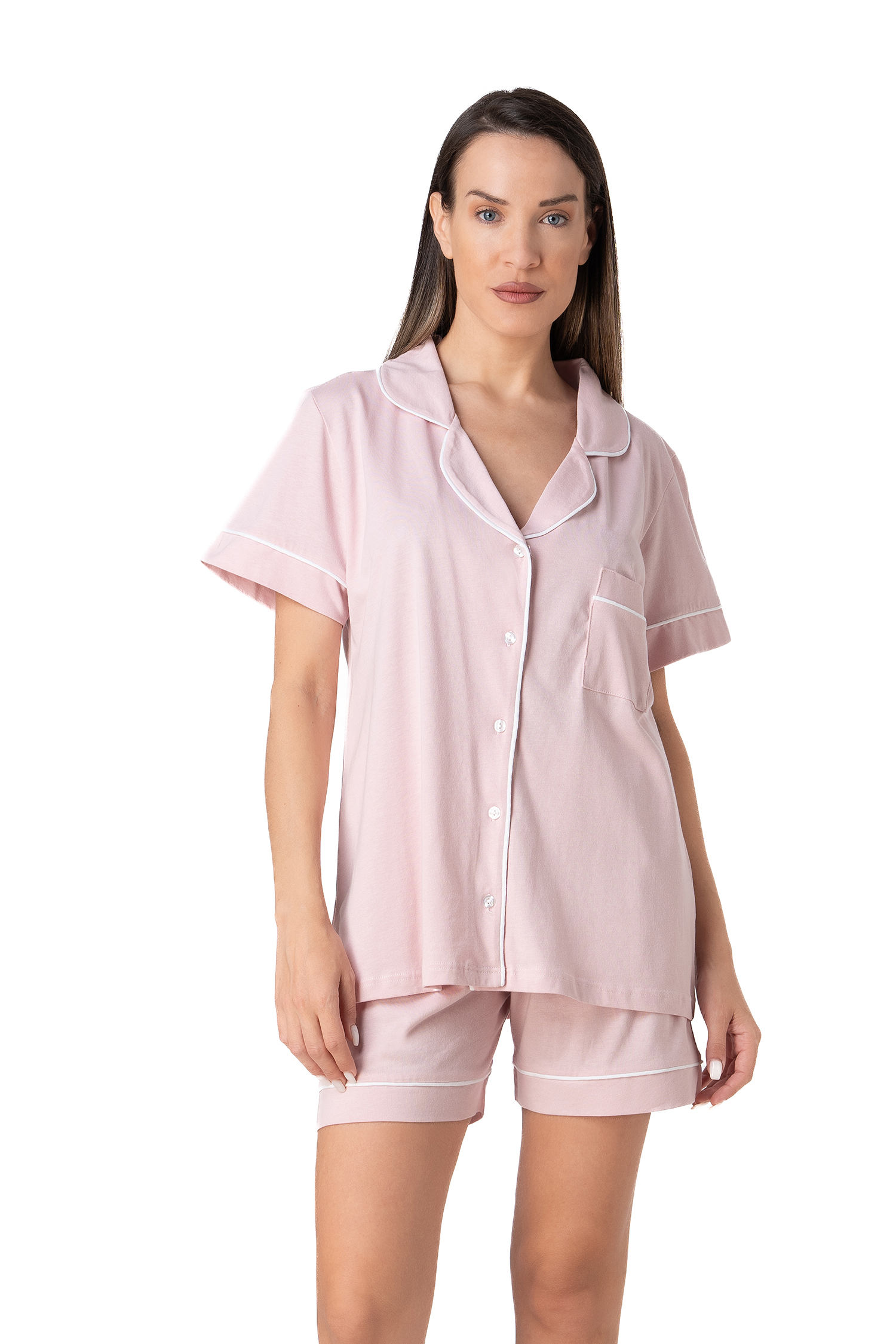 Αποτελείται από κοντομάνικο τοπ με φαρδύ γιακά και κλείσιμο με κουμπιά μέχρι κάτω, συνδυασμένο με σορτς κανονικού ύψους που διαθέτει μαλακό λάστιχο μέσης.